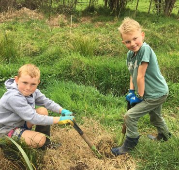 Lachlan Findlay and Jack Hay helping out with the riparian planting beside the stream.