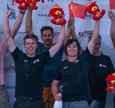 Micah Wilkinson (right) and Isaac McHardie (both in black, centre) celebrate after winning the Qingdao Mazarin Cup in China. Photo – Extreme Sailing Series.