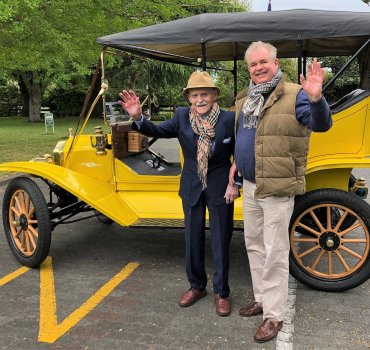 Turning on the vintage style – Dennis Warner (snr) with his Sydney-based son Dennis Warner, enjoyed a birthday ride before his party.