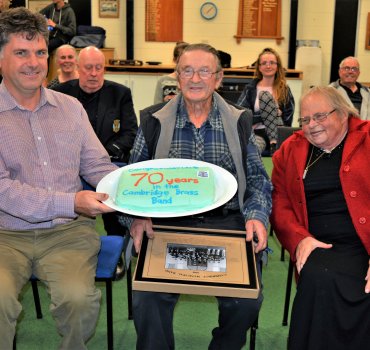 John and Joan Hargreaves were presented with a special cake last year marking their 70th year with the Cambridge Brass Band. With them at that 2017 celebration is musical director Rob Hocking.