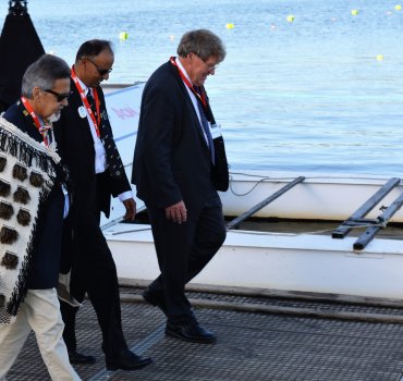 Arriving at the Don Rowlands Centre after their barge trip at the start of the convention are, from left, Lions International Second Vice-President Judge Haynes Townsend, Lions MD 202 Council Chairman Arvind Raman, and Waipa District Mayor Jim Mylchreest.
