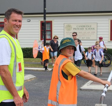 Mike Pettit, pictured in the afterschool rush with Cambridge Primary School road patroller Lachlan Copeland, said the proposed reduction from 50 to 40km/h outside his school made “absolute sense”.