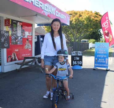 Kim Martinenghi and her son Giorgio often frequent the Sheridan Dairy, but had never seen someone take a bike there until last week.