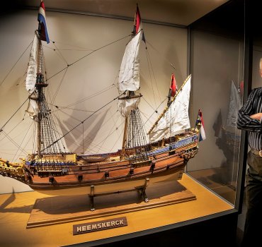 Eric Hill and the largest of his models – Abel Tasman’s vessel, the Heemskerck.