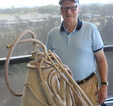 Roger Dean with his hand-crafted wooden milking system replica.