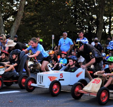 The final race featured 12 soap boxes, with each of the three first place-getters – Jacob Porteous, Chris Holmes-Burr and Gabriel Pidduck – presented with a special Soap Box Derby trophy by Olympic rowing champion, Eric Murray.