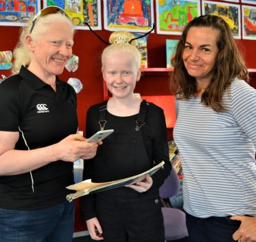 Paratriathlete Shannon Cleave, Ava Maxwell and BLENNZ resource teacher Debbie Barker at this month’s International Albinism Day at Goodwood School.