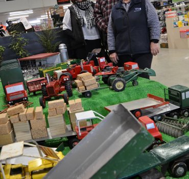Jim Kerr has been building and fixing toys for as long as he can remember, and now some of his eye-popping collection have been put on display at PGG Wrightson in Cambridge’s Duke St. That was the perfect choice of venue because most of his toys are models of agricultural vehicles or machinery, and Jim is particularly delighted to see how the Wrightson crew have added ‘farming’ touches to give the display an authentic feel.