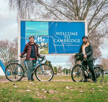 English couple Dan Burns and Jennie Burton are cycling New Zealand – and the world – and stopped in Cambridge on their way down south recently.