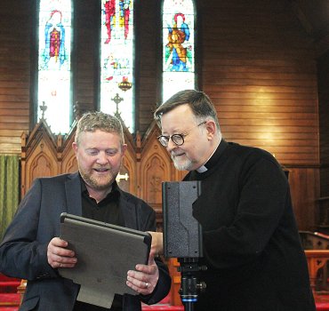 Clint Lawson (left), a man on a mission to turn historic buildings into virtual reality, has scanned and created an online walk-through of St Andrews Church, with the help of church vicar Reverend Malcolm French (right) feeding information into the online tour.