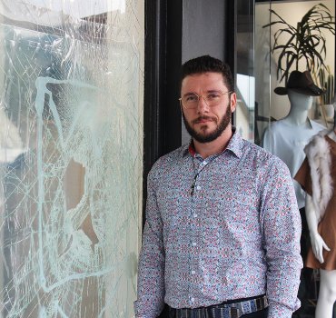 Oxfords Clothing store manager Daniel Smith assesses the damage to the Duke St store window.