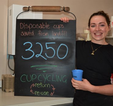 Barista Alice Jones with the board on which In-Stone Café tracks the number of cups they have prevented going to a landfill.