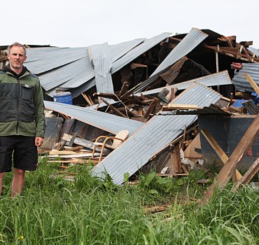 Simon and Jane Makgill’s son-in-law Steve Lee surveys the wreckage of the Makgills’ shed, which was demolished after vandals stole a digger from Pukekura subdivision on Sunday night.