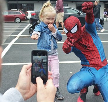 Four-year-old Isabella Vienazindis meets, and gets a photo with, Spiderman on Saturday.