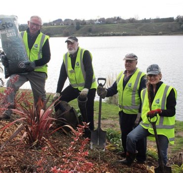 Cambridge Tree Trust volunteers Susan Boubee, Trevor Walker, John Fox and Peter Fisher planting below Canoe Racing New Zealand’s High Performance training centre at Lake Karapiro’s Mighty River Domain