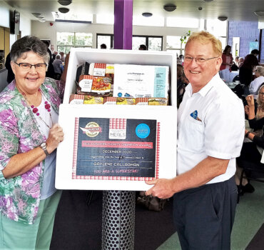 Cambridge community stalwart Gaylene Callaghan is all set for an easy-going holiday season after being presented with a box of pre-packed meals by Age Concern Hamilton Executive Officer Brent Nielsen.