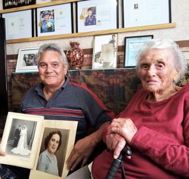 Anne Samuel and her son Mervyn pictured just before Anne’s 101st birthday. On the mantle are framed cards she received from Queen Elizabeth, Jacinda Ardern and NZ Governor General Dame Patsy Reddy on her centenary, celebrated just before lockdown.