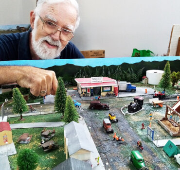 One of their number, Keith Rimmer, was led to the hobby years ago by his wife. Together they designed a curious storage cupboard with a drop-down door which accommodated the layout. Keith now creates a variety of intricate layouts, all of them replicating real places, among them miniature gold mines, a Kiwi Christmas at the beach, and more.