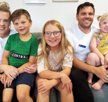 Aimee and Scott Noakes at home with their children, Leighton, Adelaide and Stella.