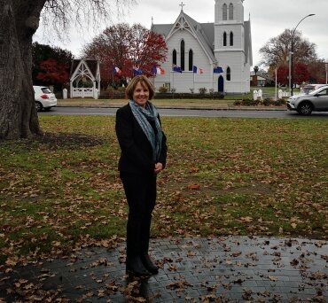 Susan Hassall in front of St Andrew’s Anglican Church in Cambridge. It was in a house next to the church that the Queen’s Birthday recipient first began her association with Cambridge. Photo: Mary Anne Gill