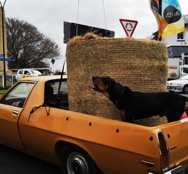 There he was, head of the parade on the back of a classic Kingswood HQ ute, his master Dean Bayley of Roto-o-Rangi behind the wheel, participating in A Howl of a Protest as only a true hard working farm dog can do.