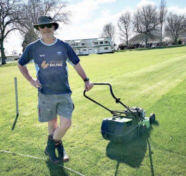 Simon Dodds mowing the Town Square wicket. Photo: Mary Anne Gill