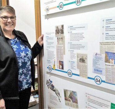 Cambridge i-Site Rachael Colgan with the timeline chronicling the organisation’s stories.