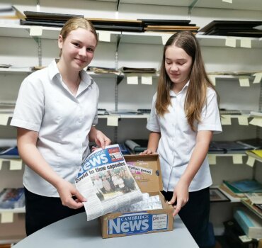 Ella Webb and Georgia Kuijpers put the Cambridge News issue of December 9, 2021, into the time capsule which will go to the Cambridge Museum as a record of Cambridge High School students’ reactions to the Covid pandemic. Other copies of last week’s newspaper, which included a story about the time capsule project on the front page, will got into other capsules which will be opened at future school reunions.