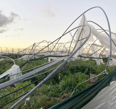 As Richard told the story, the family got home from the farmers’ market at around 1pm on Sunday afternoon. The wind was already “massive” and ruffling some trailers. Richard soon got to work tying them down—just in time to see the orchard’s entire tunnel house lift six to seven metres in the air.