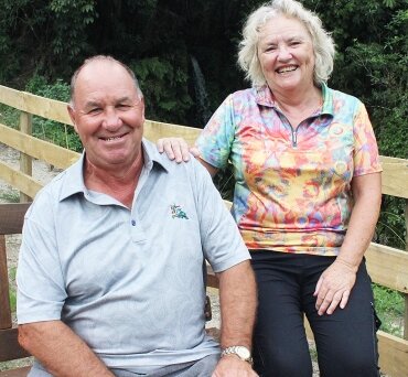 Tim and Karen Bodle on the memorial seat they donated to honour the Whakanui Stud founders.