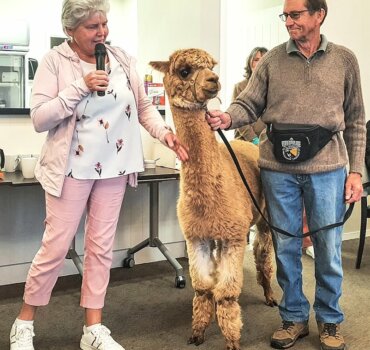 Residents at Cambridge Resthaven enjoyed a visit by some unusual guests recently when four fluffy alpacas, accompanied by their owners Lynda and Bruce Mathews, visited for the morning.