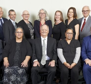 Back row, l-r: Fred Lichtwark, Andrew Macpherson, Stu Kneebone, Pamela Storey, Kathy White, Jennifer Nickel, Angela Strange, Denis Tegg, Hugh Vercoe. Front row, l-r: Barry Quayle, Kataraina Hodge, Russ Rimmington, Tipa Mahuta, Stu Husband.