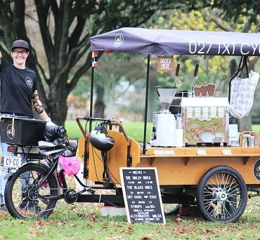 Miriam Ellis parks her custom-made cycle coffee cart in Payne Park outside Resthaven in Cambridge while Te Awamutu’s Rebecca Petch plies her trade from inside a renovated caravan in the old Bunnings building carpark not far away.