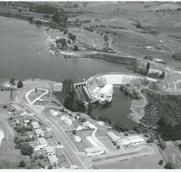The former Power House Café, left of this 1969 photo, housed dam administration staff during construction. Photo: Archives New Zealand – Communicate New Zealand Collection R24739205 Photographer: Mr Anderson