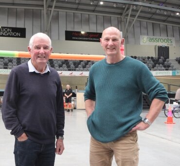 Home of Cycling Trust chair Graeme Maw with former Waipā mayor Alan Livingston at the Cambridge Velodrome where behind them there are plans to expand and bring three sporting halls of fame to the venue. Photo: Mary Anne Gill.