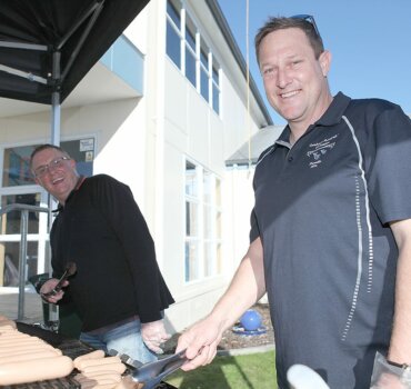 CMS principal Daryl Gibbs barbecues sausages for students and their whanau with Merv Harvey.