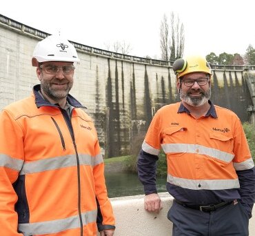 Standing in front of the dam bridge and road are l-r Matt Kedian, Mercury New Zealand head of operations, Generation and Andrew Rye, Mercury New Zealand regional manager north.