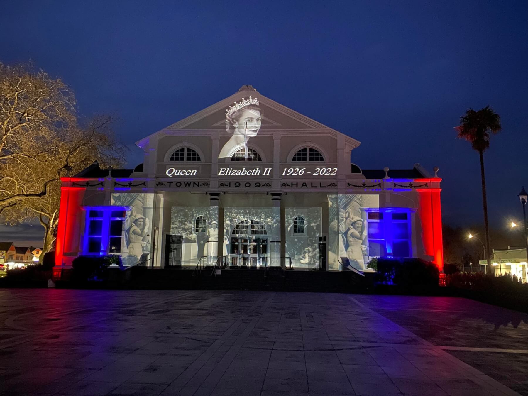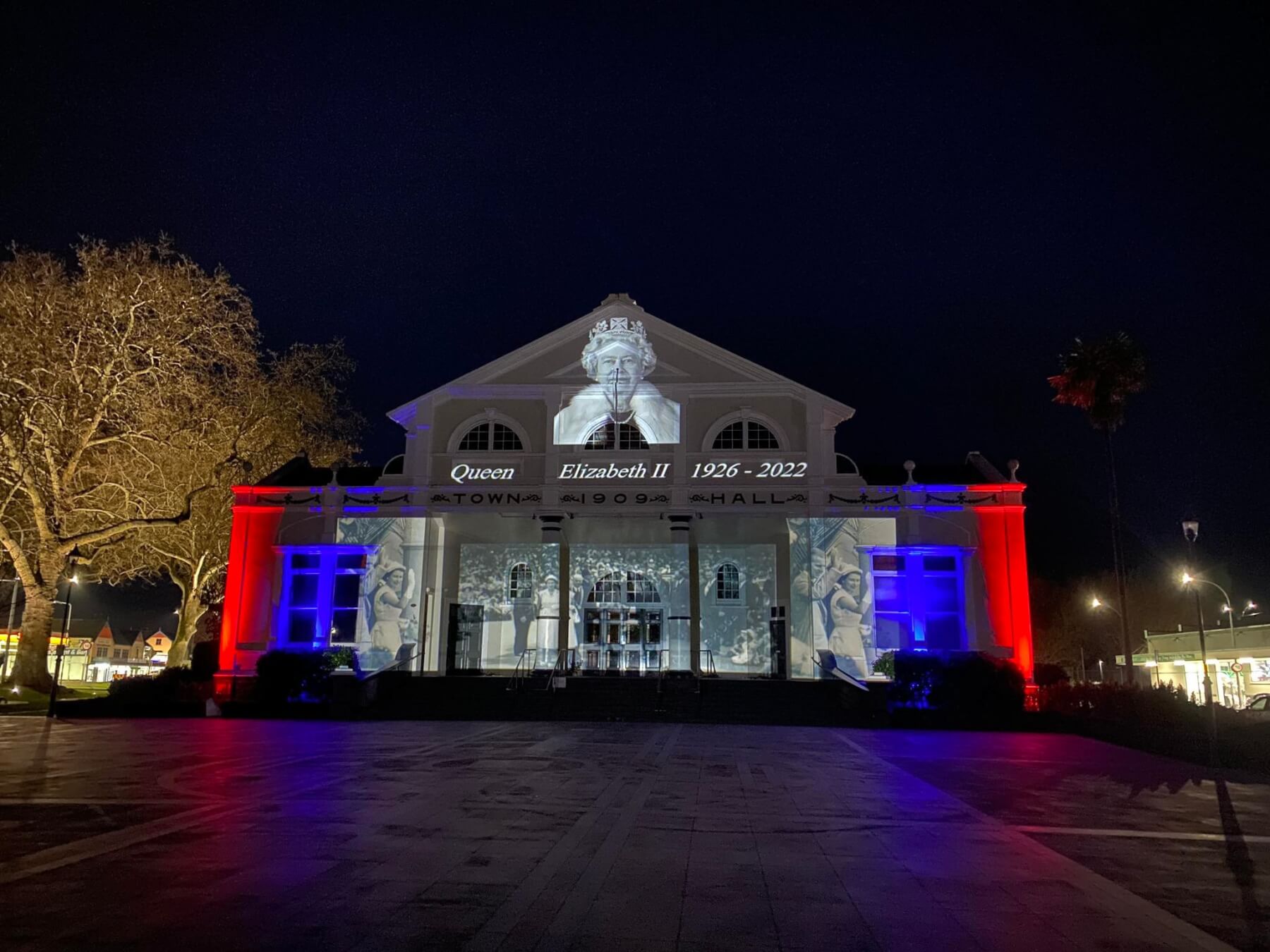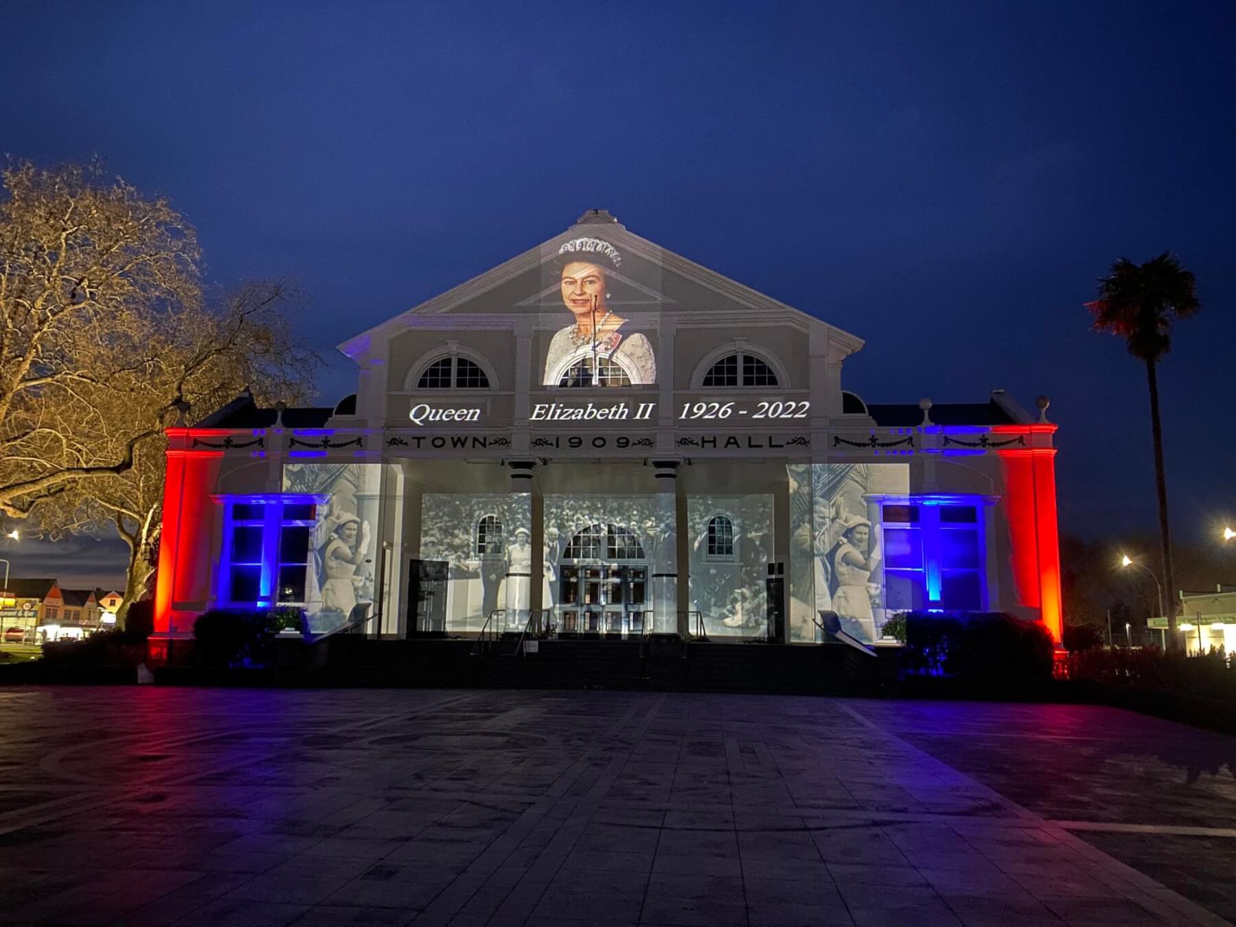 The lightshow began on Friday at 7:30pm on the Cambridge Town Hall with images of the Queen and the Duke of Edinburgh and finishes on Monday September 19, finishing at 11pm, noting the Queen’s funeral starts at 10pm (NZ time).