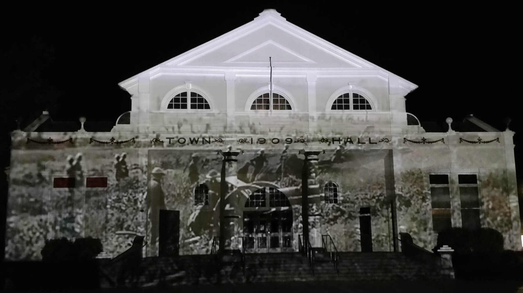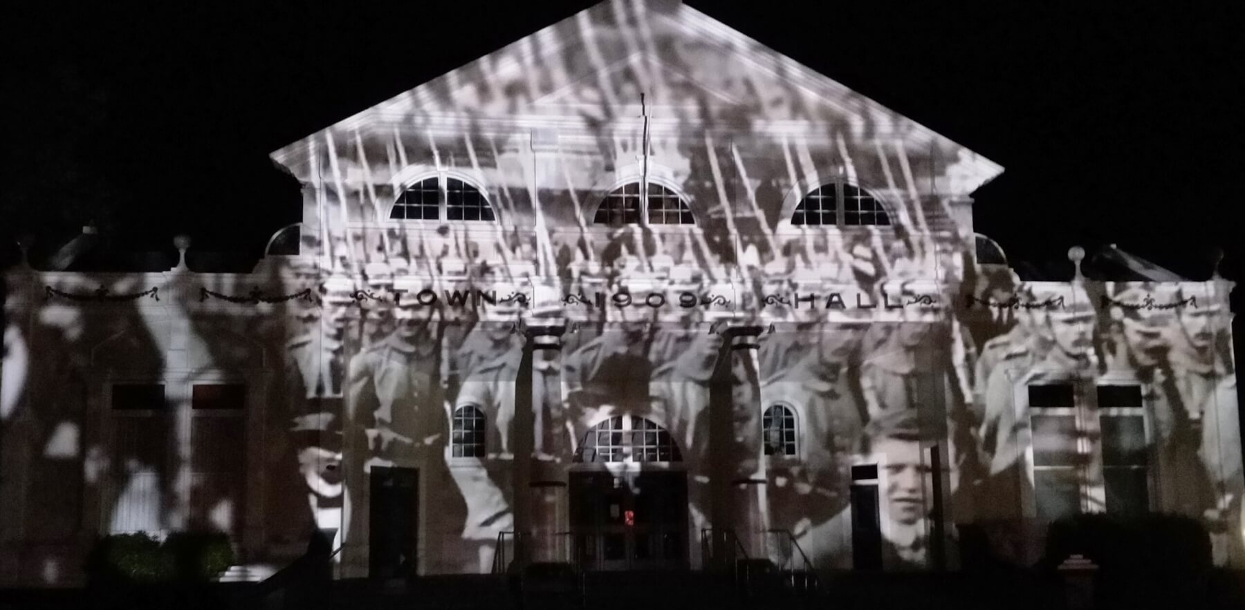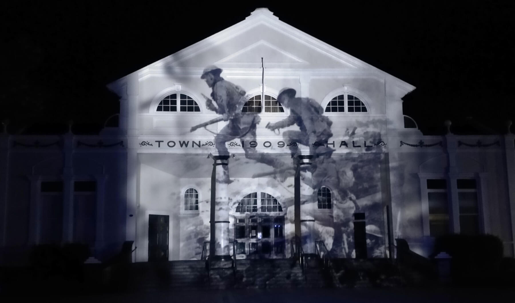 Lighting company SBI Productions was able to use the template it used four years ago for the Le Quesnoy remembrance celebrations to show the queen on the hall’s first floor – where once there was a cinema – at three different stages of her reign.
