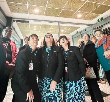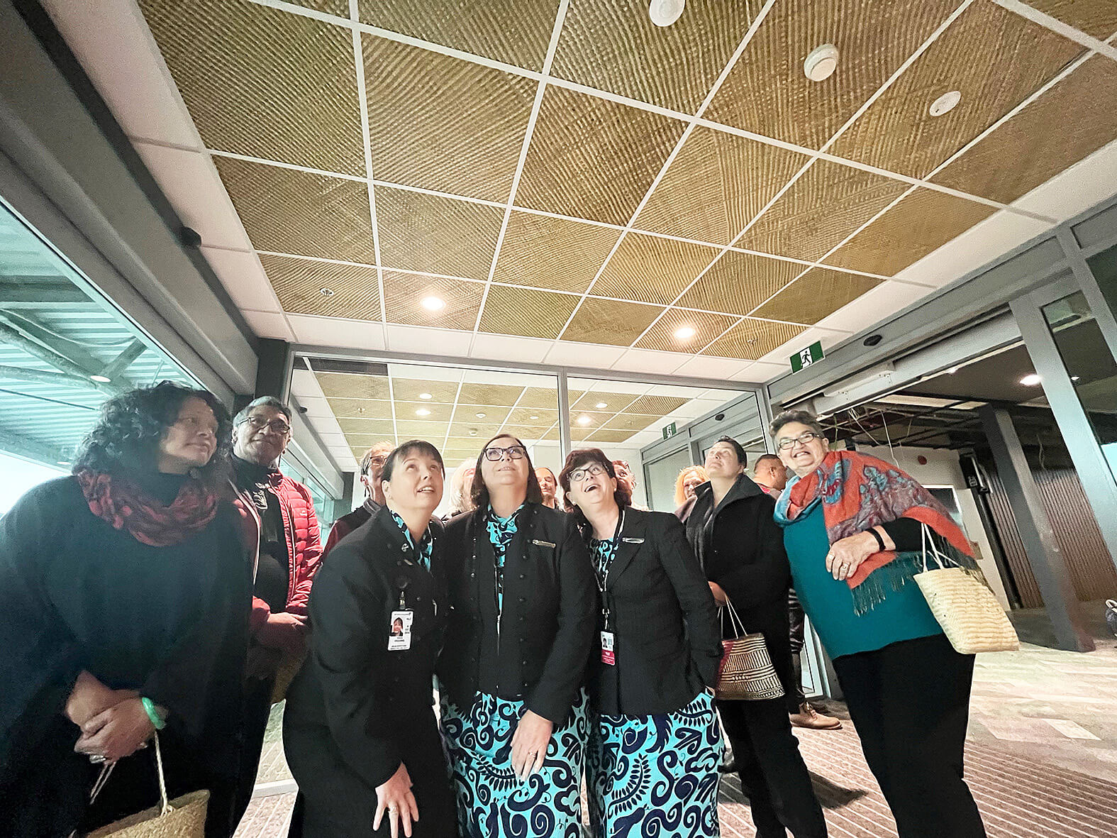 The placement of flax weaved ceiling panels – raranga – at the Hamilton Airport departure gates are designed to calm anxious travellers before they board their airplane. And the Air NZ Hamilton Airport team, from left, Maree Higgins, Linda McCann and Hilary Crow, with Ngati Haua representatives, checked them out during last week’s unveiling. Photo: Jason Dawson
