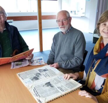 Cambridge Health and Community trustees Rob Feisst and Peter Nicholl browse through maternity home history with the centre’s manager Lisa Lindsay.