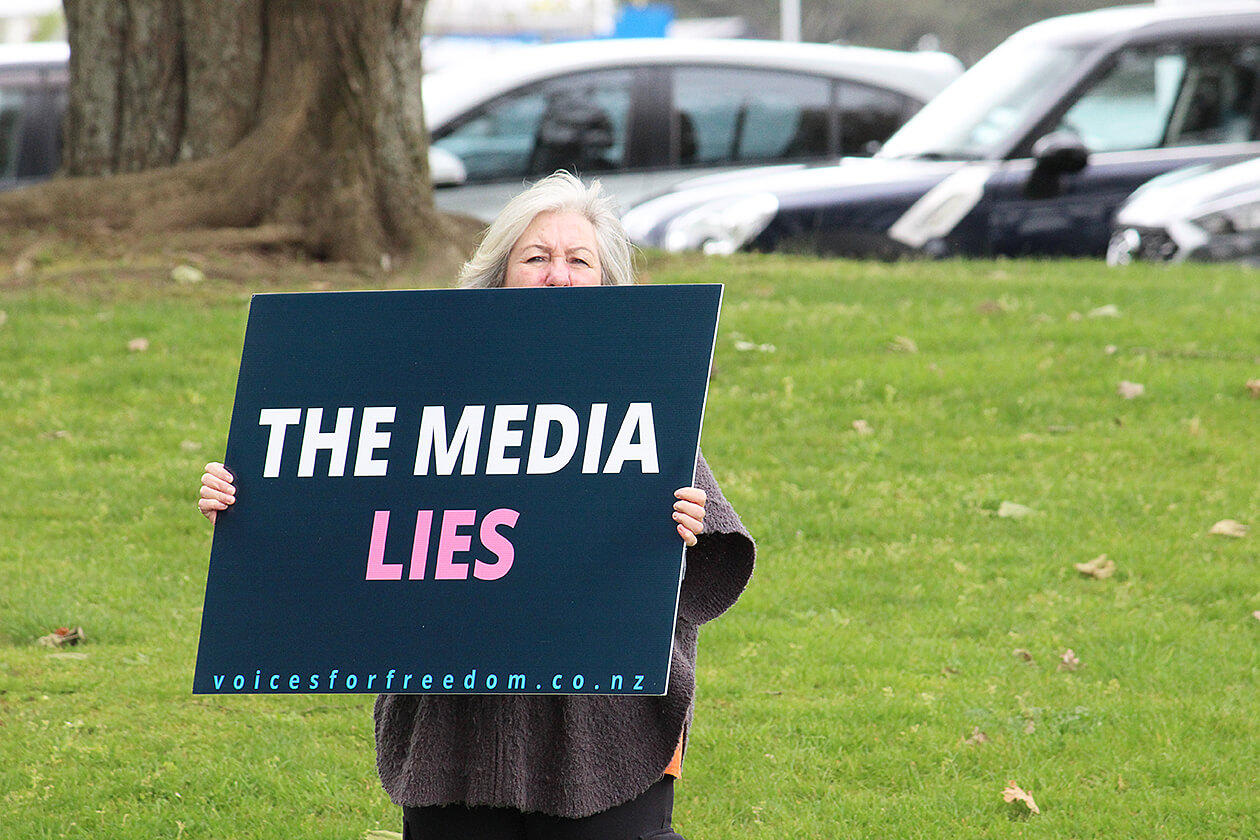 There, one woman wore a shirt proclaiming: “New Zealand mainstream media are mercenaries of state terror”.