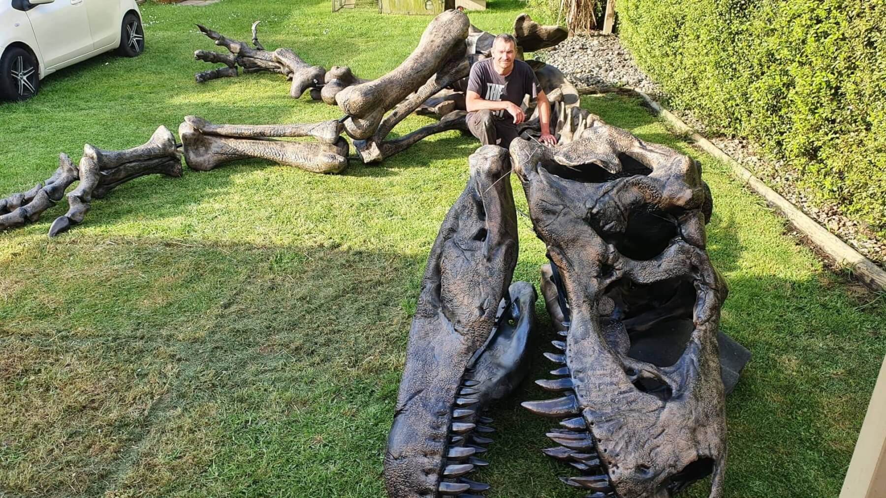 Clark’s lounge boasts a full scale raptor – and outside he is working on what will be a four metre tall skeleton of Tyrannosaurus Rex.