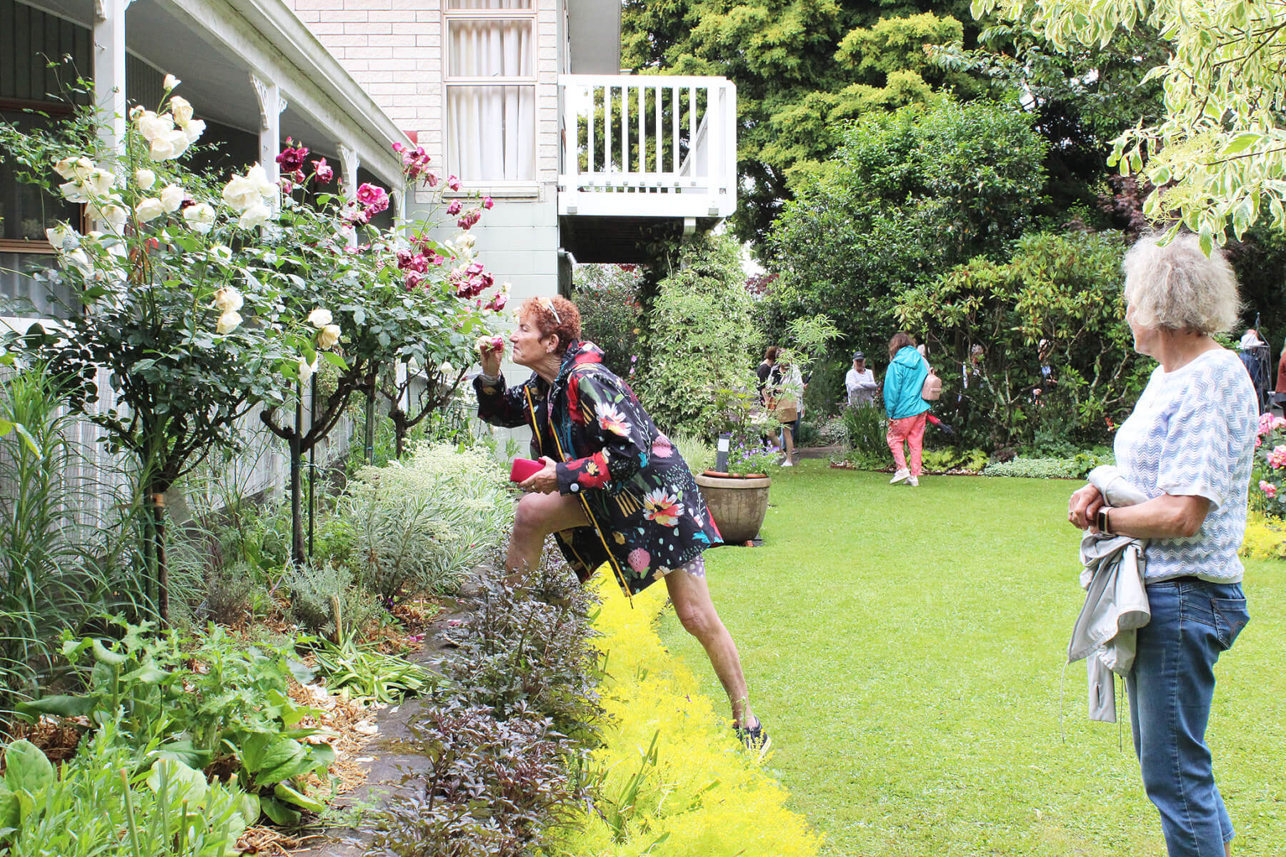 A “Large Residential Surprise” in Shelley Street owned by Katherine Tozer and Peter Tribe where roses attracted sisters in law Glenda Rodger (Cambridge) and Dianne Rodger (Hamilton).
