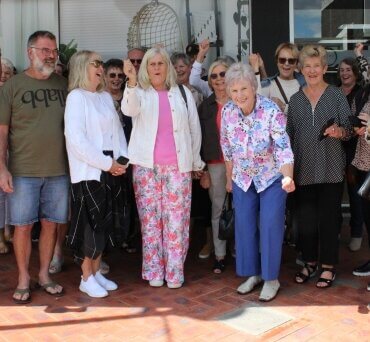 Friends and supporters of Gaye Bezzant celebrated as her bronze plaque was unveiled in Cambridge’s Duke Street last week. Gaye was thrilled with the position she is in outside Flooring Xtra and sandwiched between two men who had a close association with her late husband Max.