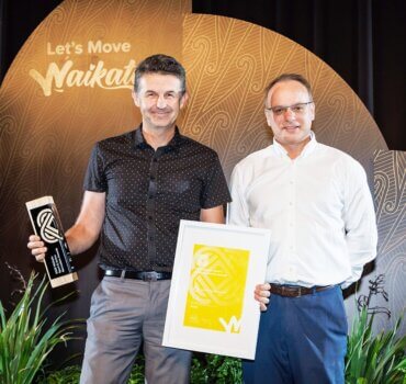 Andrew Langman, left, pictured at last week’s awards with Sport Waikato chair, Phil Taylor. Photo: Sport Waikato