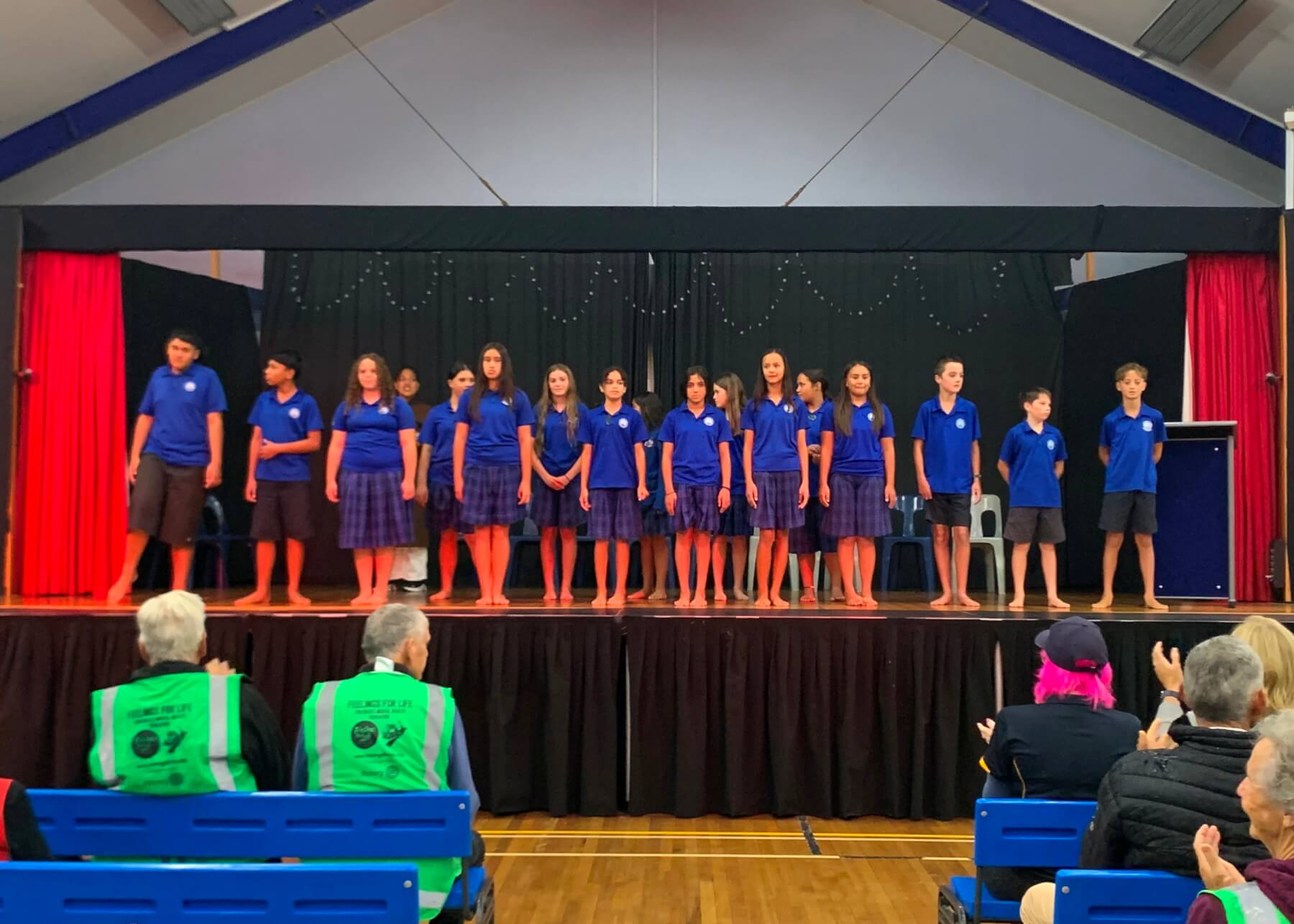 - Co-presenter Willi Henley, Cat Levine and daughter Lexi Day and Cambridge Primary School students, from left Lexi Day, Wiulli Henley, Lansley Davies-Colley and Amelie Burns. Photo: Steph Bell-Jenkins
