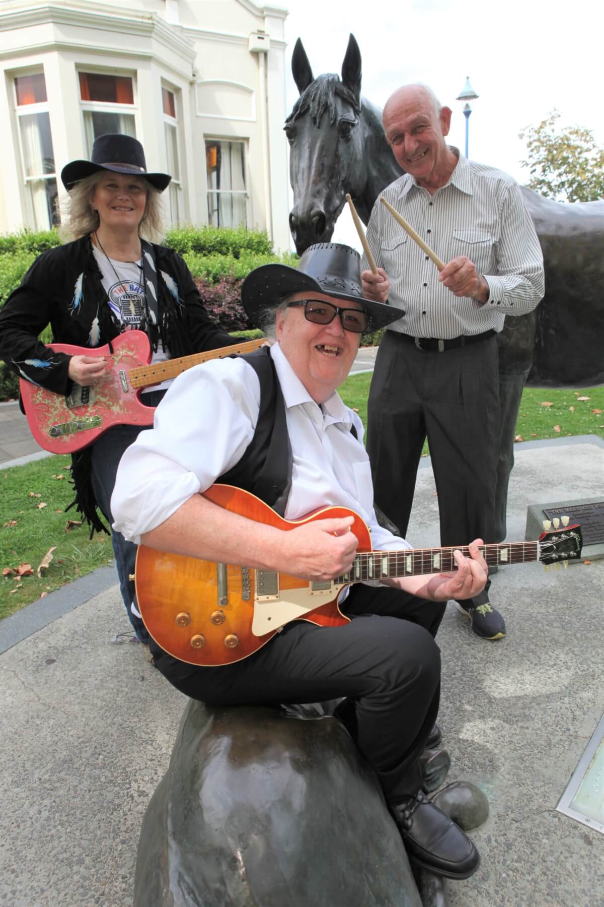 - Tina Turley, left, and Big Johnny Blue, centre, direct from Canada with drummer, Kiwi Dean McGaveston, ahead of their appearance in the Cambridge Autumn Festival. Photo: Steph Bell-Jenkins.