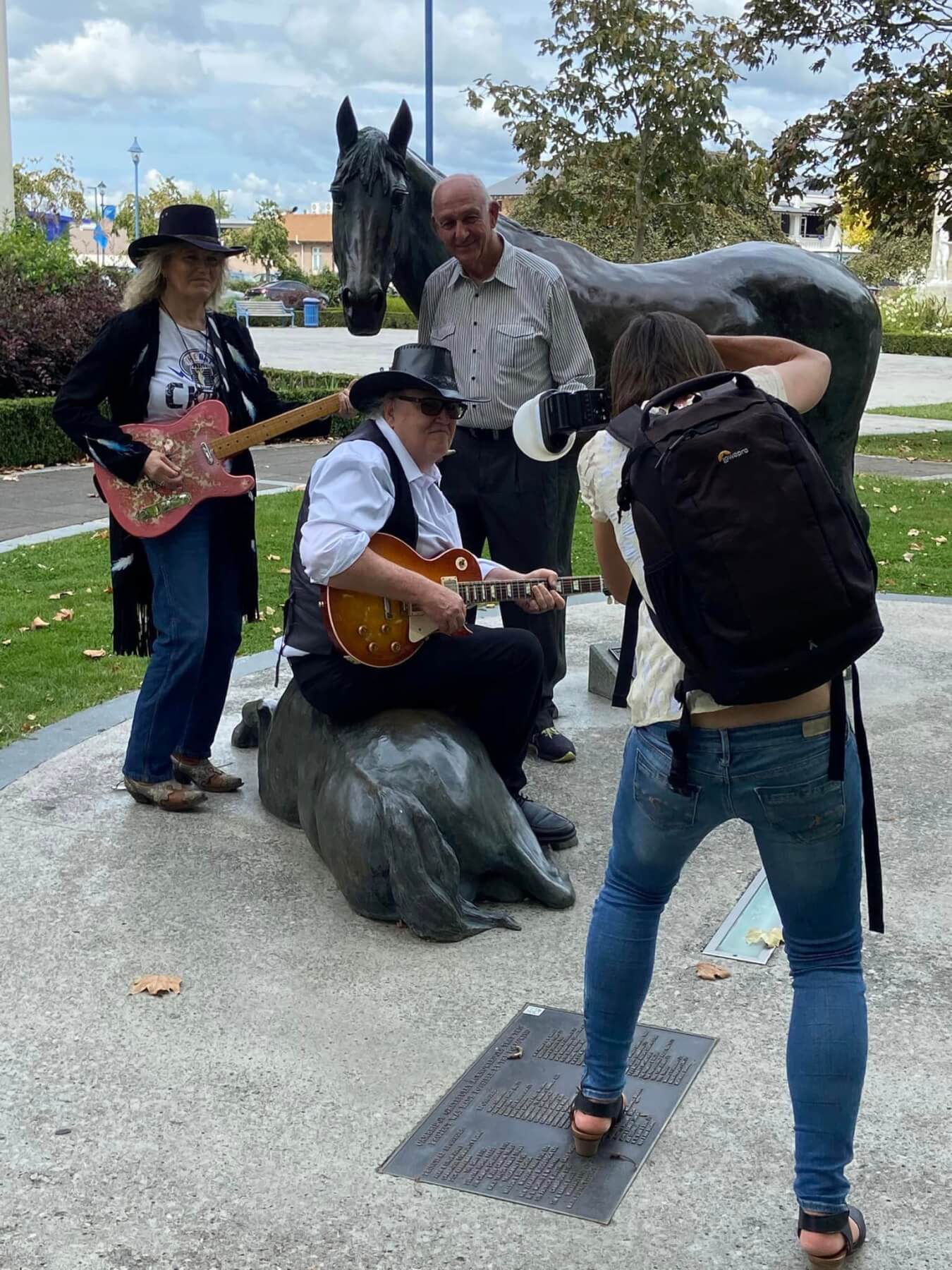 Tina Turley, left, and Big Johnny Blue, right, direct from Canada with drummer, Kiwi Dean McGaveston, ahead of their appearance in the Cambridge Autumn Festival. Photo: Steph Bell-Jenkins.
