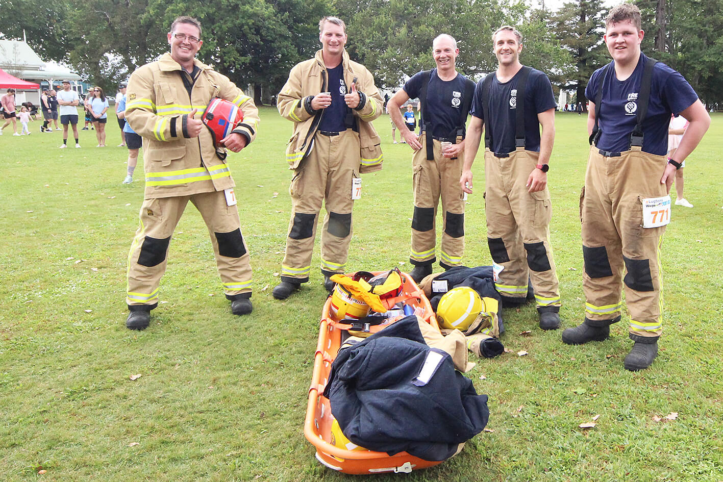 - Cambridge Volunteer Fire Brigade ran in full gear carrying a stretcher full of fire fighting equipment. From left: Leon Vincent (773), Michael Morton (772), Phil Johnston (774), Tyler Six (775), Caleb Hassman (771).